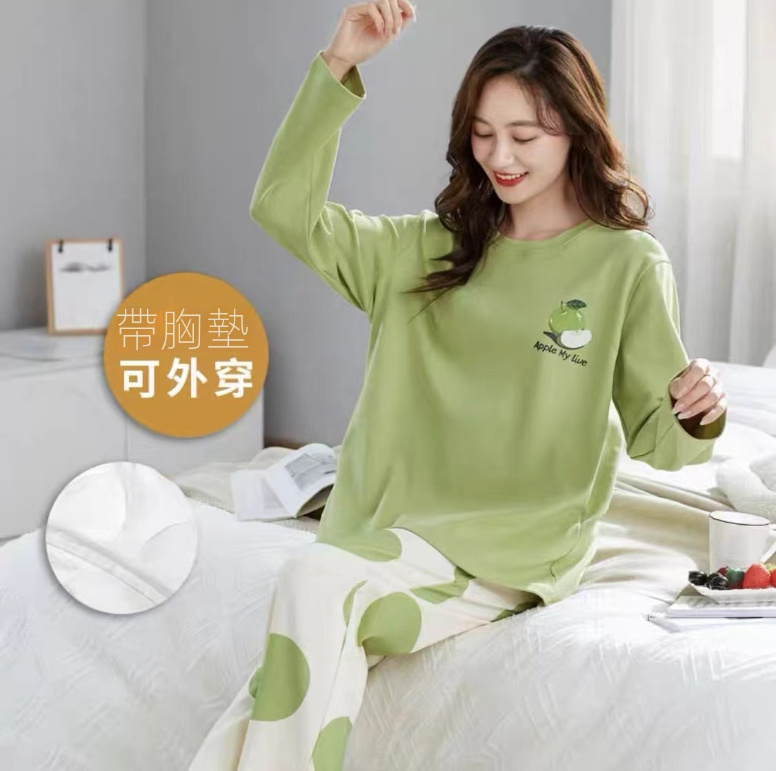秋季慵懶睡衣套裝,長袖+長褲兩件套,自帶胸墊一體式設計,可居家可外穿,重要的是完全不挑身材喲!誰穿誰好看!