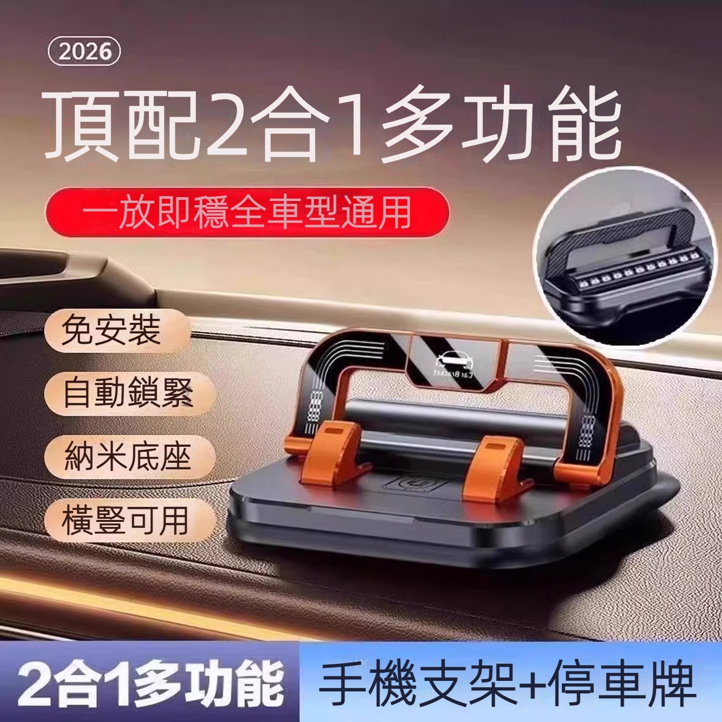 2026款車載號碼牌手機支架,可360°旋轉,一放即穩,自動鎖緊,納米底座,橫豎可用,全車型通用